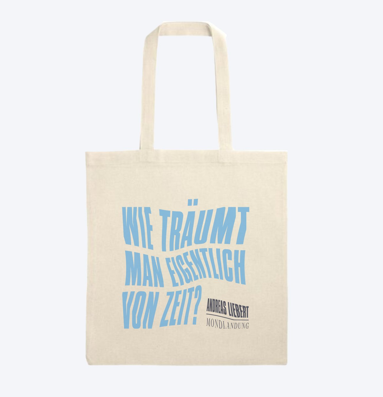 Baumwoll-Stoffbeutel in Naturfarbe mit langen Henkeln. Einseitig bedruckt mit dem Schriftzug: „Wie träumt man eigentlich von Zeit?“. Ideal für den Alltag oder als Tasche für Vinyl.